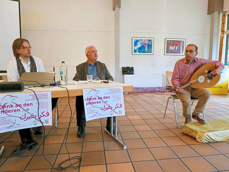 Auch Gedichte deutscher Dichter wie Bertolt Brecht und Friedrich Nietzsche, beide mit Exil-Erfahrungen, wurden zitiert. Das Spiel auf der arabischen Laute von Prof. Dr. Assaad Elias Kattan, der an der Uni Münster orthodoxe Religion unterrichtet, rundete die hochkarätige kulturelle Begegnung ab. Im Anschluss ergab sich bei Getränken und Snacks Gelegenheit zum Austausch.